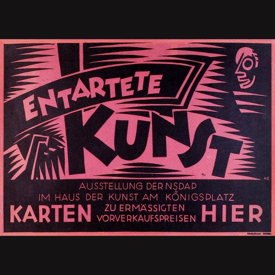 Livro "Almansor", de Heinrich Heine. Alemanha, ed. 1906. Acervo Museu do Holocausto de Curitiba. Cortesia de Kurt Krakauer Z"L. "Onde livros são queimados, ao final, também são queimadas pessoas." Heinrich Heine (1797-1856) Liberdade e criatividade são inimigas dos regimes autoritários – e, por isso, o nazismo perseguiu também artistas. O termo que usavam, “arte degenerada”, foi herdado das teorias eugenistas e racistas. Ele estava associado à ideia de decadência e corrompimento, e foi aplicado às obras e movimentos que não estavam de acordo com as concepções políticas e estéticas do Terceiro Reich. Expressionistas, dadaístas, surrealistas, cubistas e demais artistas ligados às correntes modernistas propunham, desde o início do século XX, a libertação das artes quanto às tradições, seu uso na crítica política e social, a defesa da individualidade criativa e pluralidade da expressividade humana. Foram todos tratados como inimigos do pensamento único, base ideológica do Totalitarismo. Milhares de livros, quadros e outras obras foram confiscados, vendidos ilegalmente para financiar o regime, censurados ou destruídos na luta contra a diversidade de pensar, sentir e ser. A liderança nazista, composta boa parte por artistas frustrados, chegou a organizar exposições de obras consideradas “degeneradas” com o intuito de ridicularizá-las e humilhar seus autores. Para seu enorme desgosto, as exposições tiveram enorme público. Nem todos pareciam concordar. Imagem 1: Cartaz da exposição de "Arte degenerada" na Haus der Kunst, 1937 Wikimedia Commons