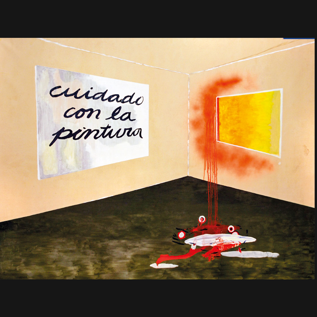 "Cuidado con la pintura" a.k.a La (o mi) Peralta Ramos, 2010 Last disco years, 2012 Pintura Como protesto contra o prolongado fechamento do Museu de Arte Moderna de Buenos Aires devido a uma remodelação, Alejandra Seeber imaginou montar salas de exposição onde estas grandes telas substituiriam as paredes que faltavam. As duas pinturas expostas fazem parte de um sistema articulado com relações entre si, com a história da arte argentina e além. Em Cuidado con la pintura, Seeber representa numa dentro de sua obra Cuidado con la pintura, a representação de um letreiro (“Cuidado con la pintura”) com o qual Peralta Ramos interveio provocativamente na galeria Arte Nuevo em 1971, durante seu auge conceitual. Uma frase, porém, que na Argentina costuma ser colocada para anunciar que uma parede acaba de ser pintada e evitar manchas acidentais. Quatro décadas depois, com a pintura mais uma vez dominando a cena artística argentina, esta obra é uma ameaça contra os desavisados. Já Last disco years funciona para a artista em conjunto com o primeiro trabalho: esta seria a obra arrancada da parede em Cuidado com la pintura, passando de uma representação pictórica para uma presença concreta na sala expositiva.