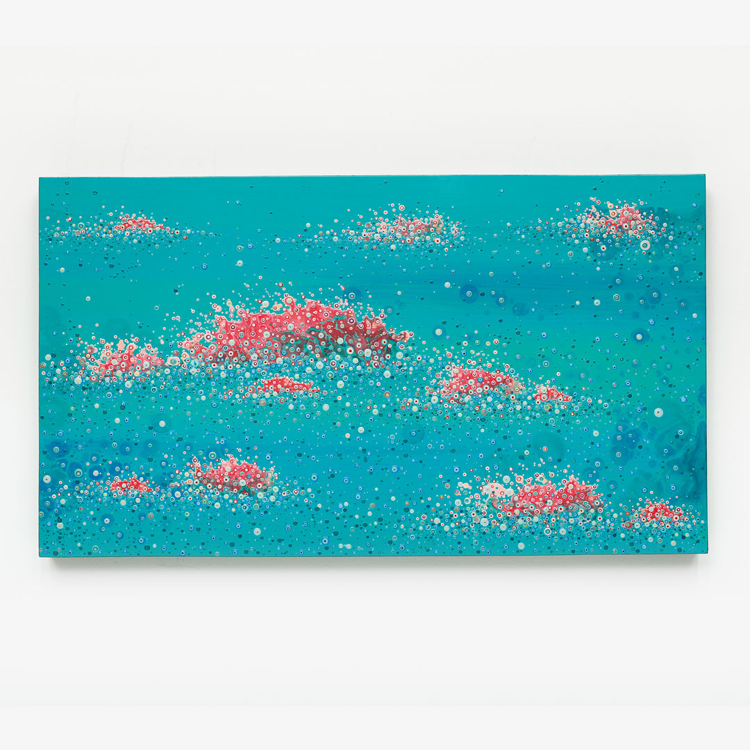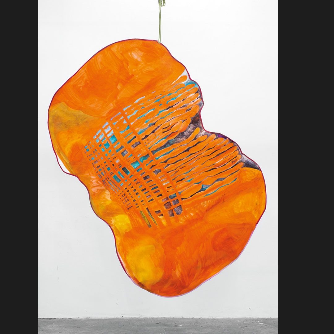Pintura Após os anos nos quais forjou seu nome como figura central da arte dos anos 1990 e antes que seu trabalho como artista plástico fosse complementado por ambiciosos projetos de releitura da tradição das artes visuais argentinas, a produção de Marcelo Pombo se concentrou por aproximadamente uma década na realização de grandes obras inteiramente em esmalte. Cada uma delas, das quais a que vemos aqui faz parte, é fruto de um trabalho meticuloso e demorado. O dripping, que já tinha aparecido em suas produções anteriores, é agora um exercício de precisão por meio do qual as obras constroem, com camada sobre camada de brilho untuoso, a espessura cromática resplandecente de paisagens imaginárias. Partindo de novas ferramentas, porém, neste trabalho também vemos aquela forma de beleza que Pombo descobriu na década de 1990 para a arte argentina e que é a continuidade, por outros meios, do artesanato que costuma adornar as casas populares do país.