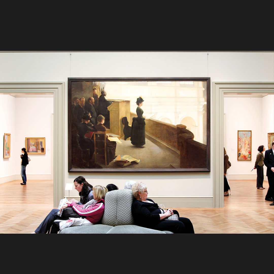Fotografia Como curador, professor e fundamentalmente como artista, Alberto Goldenstein construiu nas últimas três décadas um modo de fazer e um modo de ser para a fotografia (pelo menos, para a melhor dela) dentro da arte contemporânea argentina. Uma atitude estética que, sem trair um compromisso absoluto com a fotografia, foge sempre para o lugar contraditório que o sistema das artes visuais oferece a essa disciplina. As duas imagens fazem parte da série Americana (nome compartilhado por sua primeira série, do início dos anos 1980, feita enquanto estudava em Boston). En el MoMA (Cy Twombly) deslumbra pelo seu funcionamento especular. Tudo o que acontece está contido no jogo de espelhos que faz a mediação entre o reflexo no vidro que protege a obra de Twombly e a lente de Goldenstein. Um jogo que reproduzimos quando contemplamos a fotografia. Tanto quem observa a obra no MoMA quanto quem a faz agora se vê contido e submetido à força gravitacional exercida pelas obras de arte. Já En el Metropolitan Museum I apresenta uma complexa construção geométrica, na qual os olhares e trajetórias de seus visitantes, bem como a disposição das obras e do mobiliário, operam como um desafio à harmônica e estável arquitetura simétrica. Vetores, manchas e profundidades alteram e dinamizam um jogo emocionante para o olhar que introduz, mas não controla, a figura feminina representada na pintura que observamos centralmente.