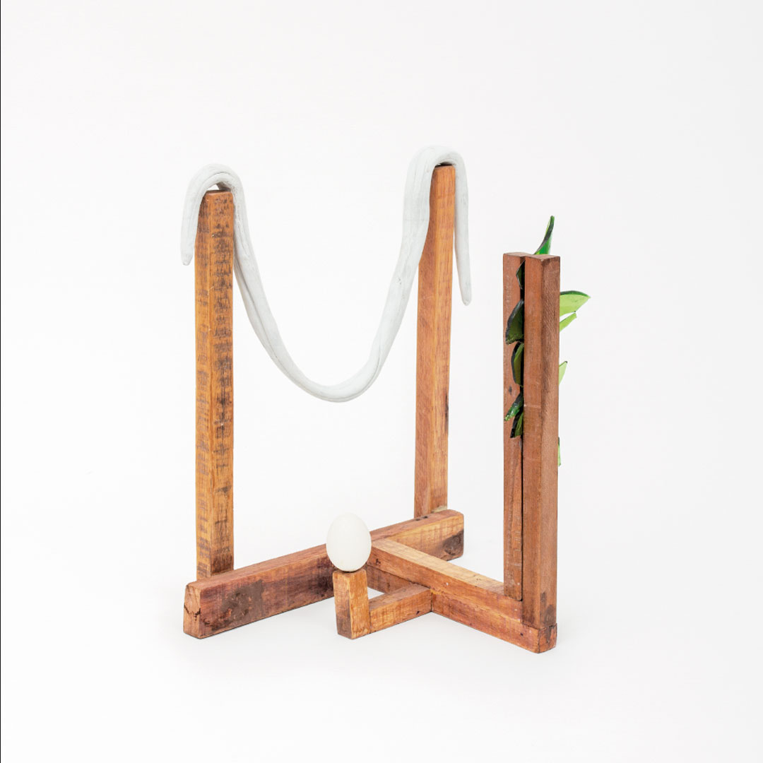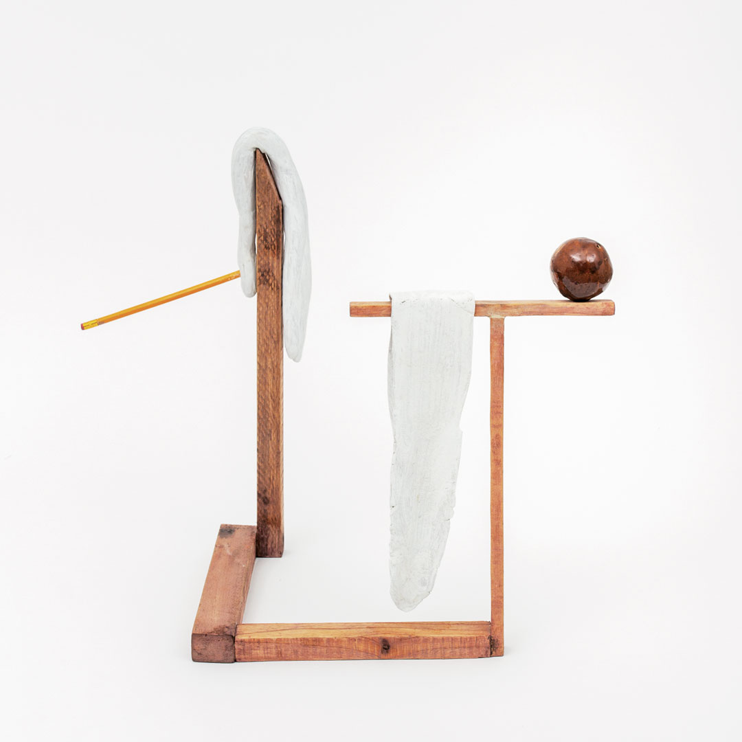 Escultura Desde seus primórdios, Diego Bianchi tem sido um observador atento dos dispositivos e estratégias de display utilizados no mundo da arte e fora dele, nas lojas e nos comércios de rua. Assim como ocorre na obra Coleccionismo, aqui presente, nestas duas esculturas percebemos a mise-en-scène como recurso intencional. Neste caso, construído a partir da tensão entre uma série de formas e objetos encontrados ou criados pelo artista e os estandartes de madeira que os apresentam. A estrutura geométrica de madeira suporta e exibe elementos tão inconsequentes quanto essenciais ao vocabulário material de Bianchi. Lá descobrimos fragmentos de garrafas de vidro, formas suaves, um ovo e um lápis, elementos que, junto aos braços ortogonais de madeira, constroem uma sintaxe, um ritmo e uma posição tão sutis e eloquentes quanto inexplicáveis.
