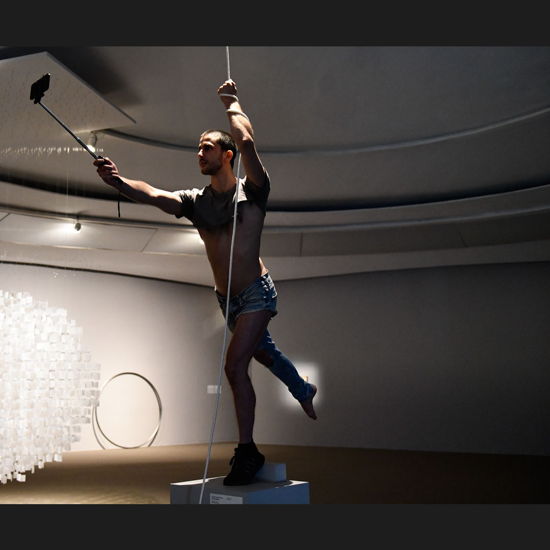 Performance Under de si é o nome da performance produzida pela colaboração entre Diego Bianchi, artista, e Luis Garay, coreógrafo. Uma experiência imersiva, coral e sem forma, composta por 28 peças individuais que ativam 50 performers simultaneamente. Em um ambiente que juntava a discoteca à masmorra ou o shopping à pornografia, numa sucessão de situações desconcertantes, evocativas e exemplares, expunham o desejo em todo o seu brilho e pathos. Um teatro sarcástico, eufórico e contraditório, que transformava as reações dos espectadores em espetáculo. Selfie boy, a obra que aqui apresentamos, oferece-nos, por meio de uma citação, o clássico Hermes, o escravo contemporâneo da representação de si mesmo que, do alto do seu pedestal, desafia diretamente a nossa compulsão por nos tornar públicos.