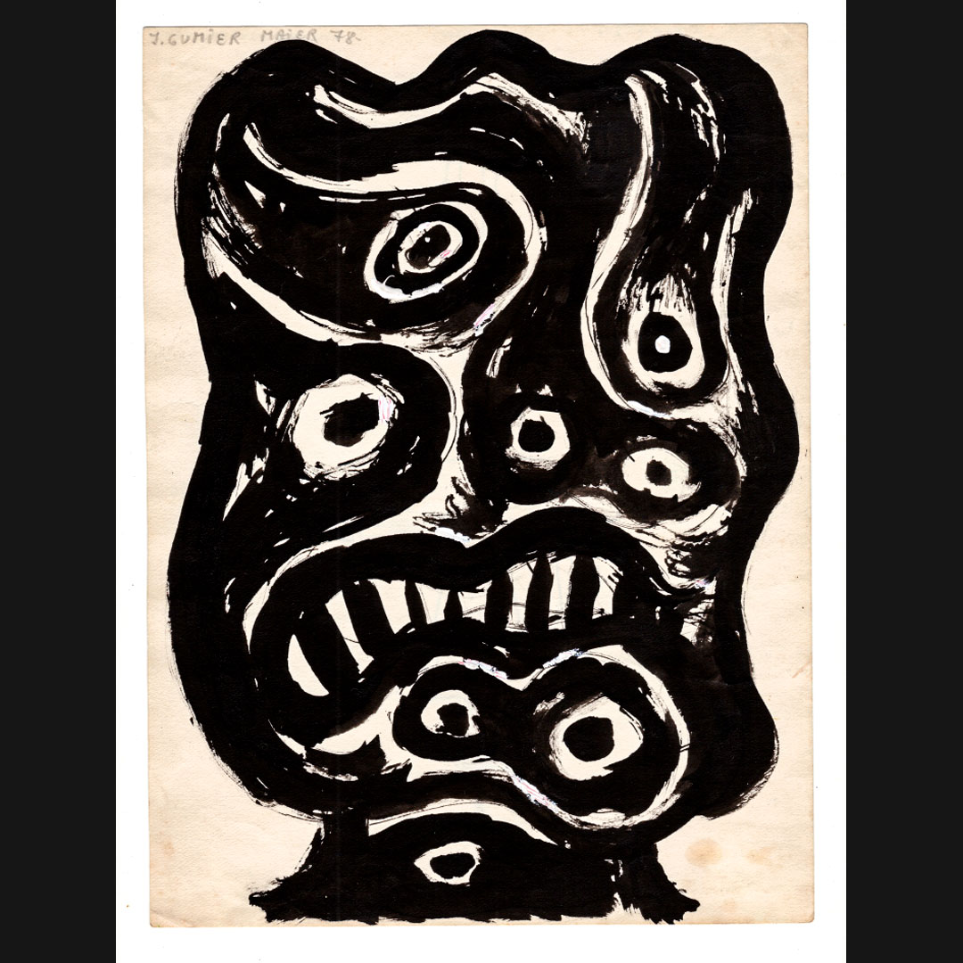 Desenho Enquanto a última ditadura militar perfurava de chumbo a sociedade argentina, em 1978, a Copa do Mundo distraia a população. Jorge Gumier Maier estava angustiado e doente, e, de seu leito de convalescença, modelava diária e obsessivamente centenas de rostos desconexos como os que vemos aqui. Cada um destes desenhos introduz ao mesmo tempo um clima de escuridão e doença, associado tanto ao momento social do país quanto à situação individual do artista. Uma obra que, em sua estridente convulsão de rostos desfigurados, parece contrastar com outra imagem: a do próprio Gumier Maier, artista e curador responsável pela sala do Centro Cultural Ricardo Rojas que, nos anos 1990, desestruturaria a sensibilidade estética da arte argentina. Contrastar sim, mas sem invalidar. Como diz Claudio Iglesias: “o abraço angustiado da história (mesmo que seja a história dos que foram enganados) e a fé explosiva no abandono da história, acompanhada da crença na arte como uma Arcádia que continua sobrevoando com segurança sobre ela, são duas atitudes solidárias.”