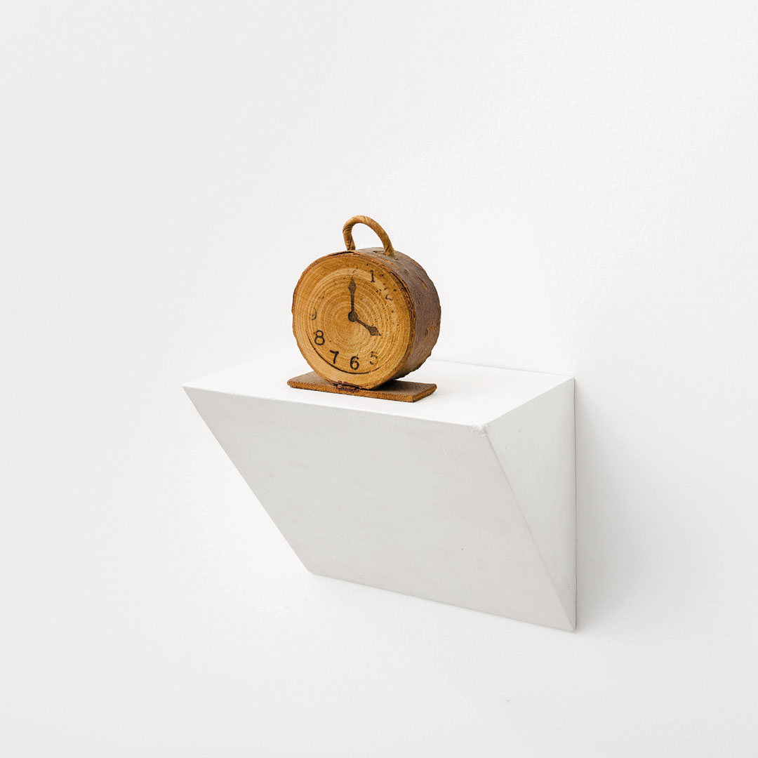 Objeto Nos últimos anos, Liliana Porter transferiu sua preocupação com a temporalidade e a representação para instalações que recriam micromundos melancólicos, habitados por bonecas, enfeites e souvenirs. Espalhados pelo espaço, os ídolos em escala Porter protagonizam narrativas dominadas pelo estranhamento, que fazem face à pretensão explicativa dos nexos causais. Em Clock, os temas de Porter são poeticamente incorporados no objeto, a partir dos desequilíbrios entre o relógio representado e o bloco de madeira que o sustenta. Aqui, alguns ponteiros apontam para a parte borrada do visor, uma área onde o pretenso relógio perde sua certeza representativa. Ali, na base desse escândalo gráfico, encontramos os anéis concêntricos gravados no tronco, onde a passagem do tempo é registrada em uma escala não cronológica e pré-representacional.
