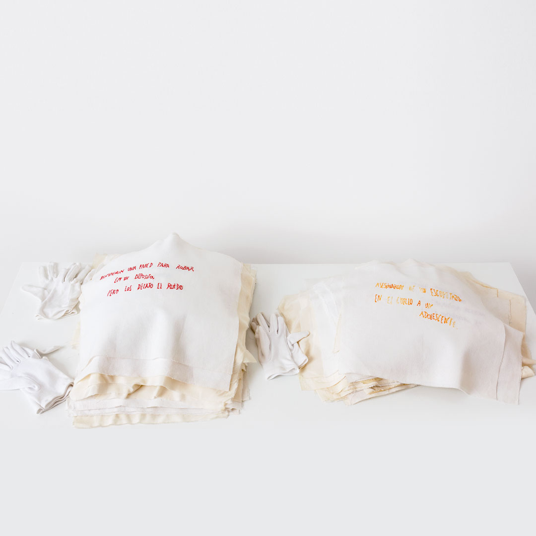 Bordado sobre tela A horizontalidade entre prática artística, ensino e ativação de projetos coletivos faz de Claudia del Río um dos nomes centrais da arte contemporânea da cidade de Rosário. Através do uso de uma multiplicidade de linguagens artísticas, incluindo colagem, desenho, escultura e textos, Del Río constrói obras pungentes – artefatos animados por uma sensibilidade crítica que pode questionar os aspectos mais complexos do presente, sem se refugiar na solenidade. Cada uma das 410 telas aqui expostas foi bordada pela artista entre 1997 e 2006 e incorpora uma manchete publicada na seção policial do jornal La Capital de Rosario, por meio do qual atos de violência eram denunciados. No centro da obra operam deslocamentos materiais e semióticos, nos quais as manchetes são transferidas do papel para o tecido, da enunciação jornalística para aquela que o mundo da arte é capaz de formular. Aqui, empilhadas e quebradiças, incorporadas em um exercício manual diário e desprovidas de referência e contexto, as chamadas se tornam tão poeticamente abstratas quanto rotundamente universais.
