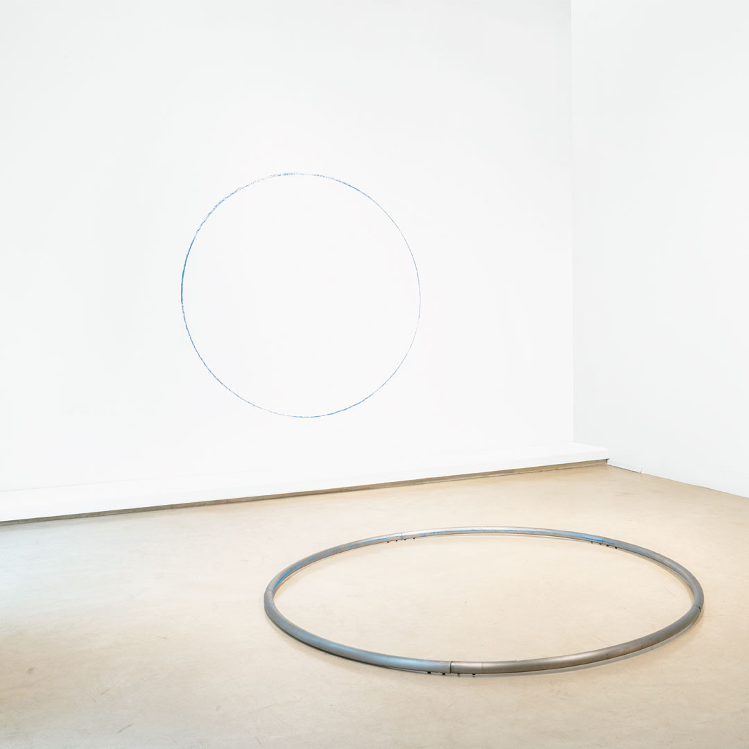 Instalação Lamelas foi um dos jovens que animaram a cena artística dos anos 1960 em Buenos Aires. Viveu em cidades como Londres, Paris e Los Angeles, onde continuou a desenvolver um trabalho tão fiel ao seu conceitualismo original quanto sensível ao magnetismo dos estilos predominantes naqueles contextos particulares. A obra que exibimos corresponde à sua mais recente produção. Um círculo de alumínio pendurado e, na parede, esse mesmo círculo desenhado. Entre os dois, há uma eloquente diferença de matéria e registro, e também, a partir de uma conjetura, há uma ordem causal. Acima de tudo, um enigma, o de seu significado, que não é preenchido pela anedota de sua origem: Lamelas pediu a um acrobata que desafiava a gravidade se balançando dentro de um anel para fazer círculos semelhantes para ele. Situación de un círculo azul pode ser associada a um dos recursos que Lamelas melhor trabalhou em sua juventude: a sinalização e, por meio dela, a capacidade que possibilita à arte vivenciar transformações contextuais. Neste caso, menos aquela que faz a mediação entre a criação dos dois círculos do que aquela que estes, aí localizados, dirigem sobre o espaço expositivo e sobre quem os observa.