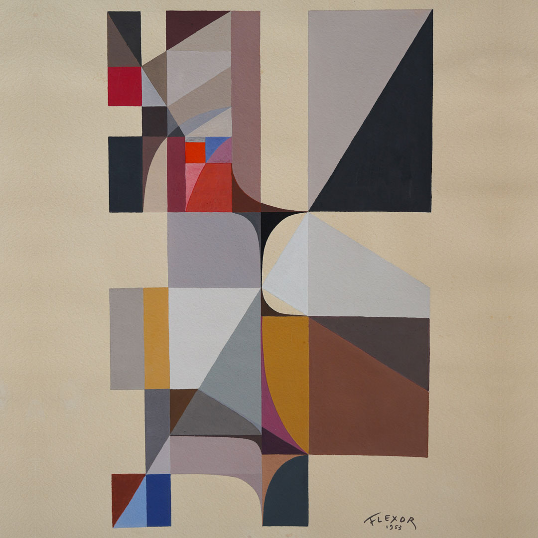 Samson Flexor Sem título, 1953 Dos artistas a Francisco Matarazzo Sobrinho, 1953 Guache sobre papel 72 x 50 cm Coleção Marcos Amaro Atelier Abstração O Atelier Abstração criado por Samson Flexor foi um dos espaços mais importantes de formação artística na cidade de São Paulo na década de 1950. O artista dava aulas em sua casa-atelier e reunia um grupo de jovens para pintar e desenhar, dentro dos princípios do Abstracionismo geométrico. O primeiro exercício proposto aos alunos era desenhar um violão com régua e esquadro. Acreditamos que ele coordenou a participação de seus alunos, pois todos apresentam trabalhos realizados dentro de uma mesma proposta: em papel com a marca do Atelier Abstração. Participam: Alberto Teixeira, Leila Perrone-Moisés, Leopoldo Raimo, Renée Malleville (seu nome aparece em vários artigos sobre o Atelier incorretamente grafado como René), Suzana Izar, Wega Nery, e Jacques Douchez.