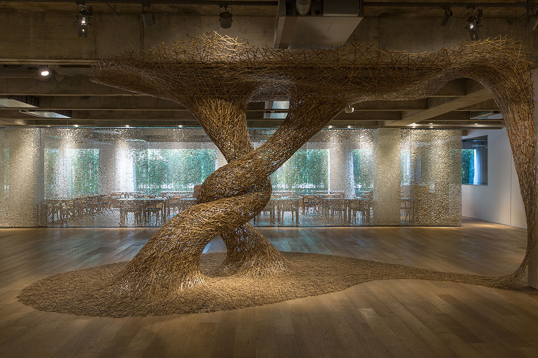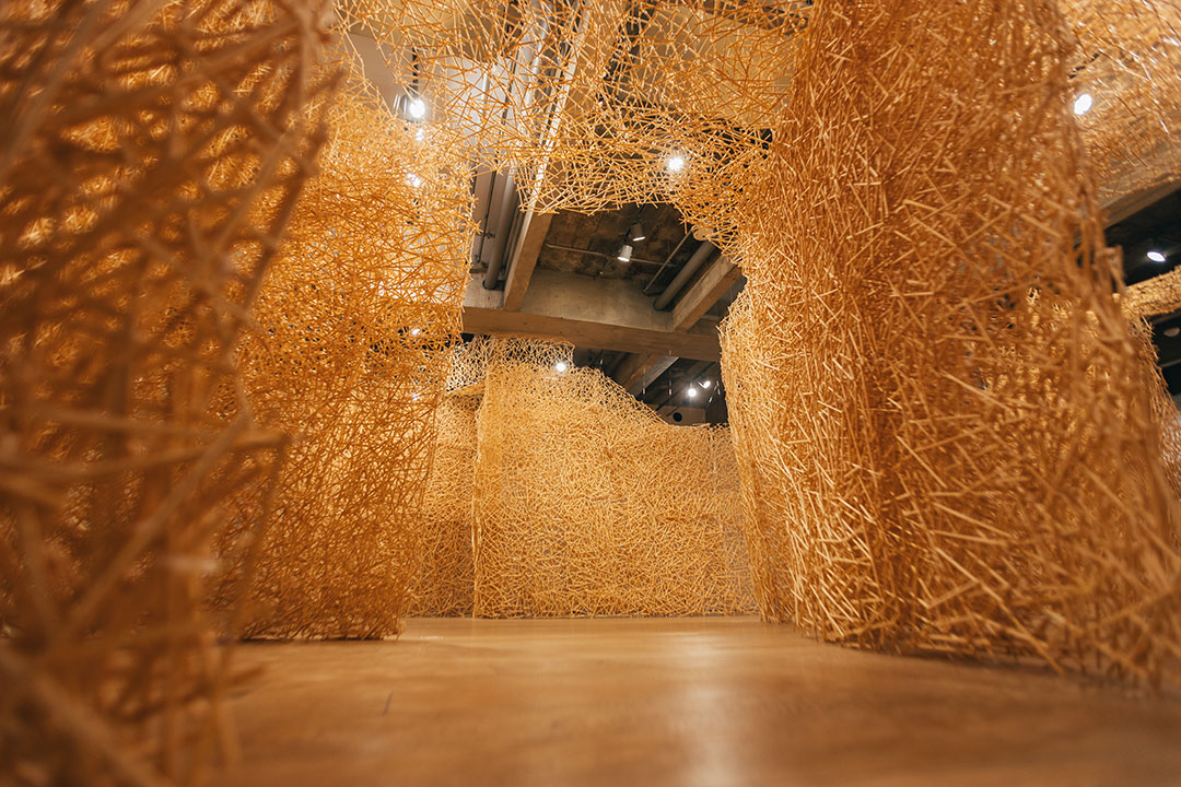 Construção Tadashi Kawamata De fevereiro a abril de 2020 Instalações de grande dimensão com o uso de materiais pouco convencionais são a marca do artista japonês Tadashi Kawamata. Para a obra Construção, criada especialmente para a Japan House São Paulo, a matéria-prima escolhida foram os hashis (par de pequenas varetas usadas pelos japoneses como talheres), importante elemento do cotidiano da cultura nipônica. Em seu trabalho, Kawamata levanta questões sobre as necessidades e os desejos humanos, ressignificando objetos corriqueiros. Famoso pelo reaproveitamento de materiais, ele utilizou em Construção mais de 180 mil hashis que seriam descartados, por não atenderem às exigências de padrões para sua finalidade tradicional. A montagem contou com o envolvimento de cerca de 40 voluntários – estudantes universitários – sob a supervisão do artista. A mostra apresentou também uma série de fotos e vídeos das principais intervenções realizadas ao longo da carreira de Kawamata, que já participou da Bienal de Veneza, da Documenta de Kassel, e produziu obras site specific em Paris, Berlim, Tóquio e Nova Iorque. A mostra marcou o retorno do artista ao Brasil após mais de 30 anos – em 1987, participou da 19ª Bienal Internacional de São Paulo.