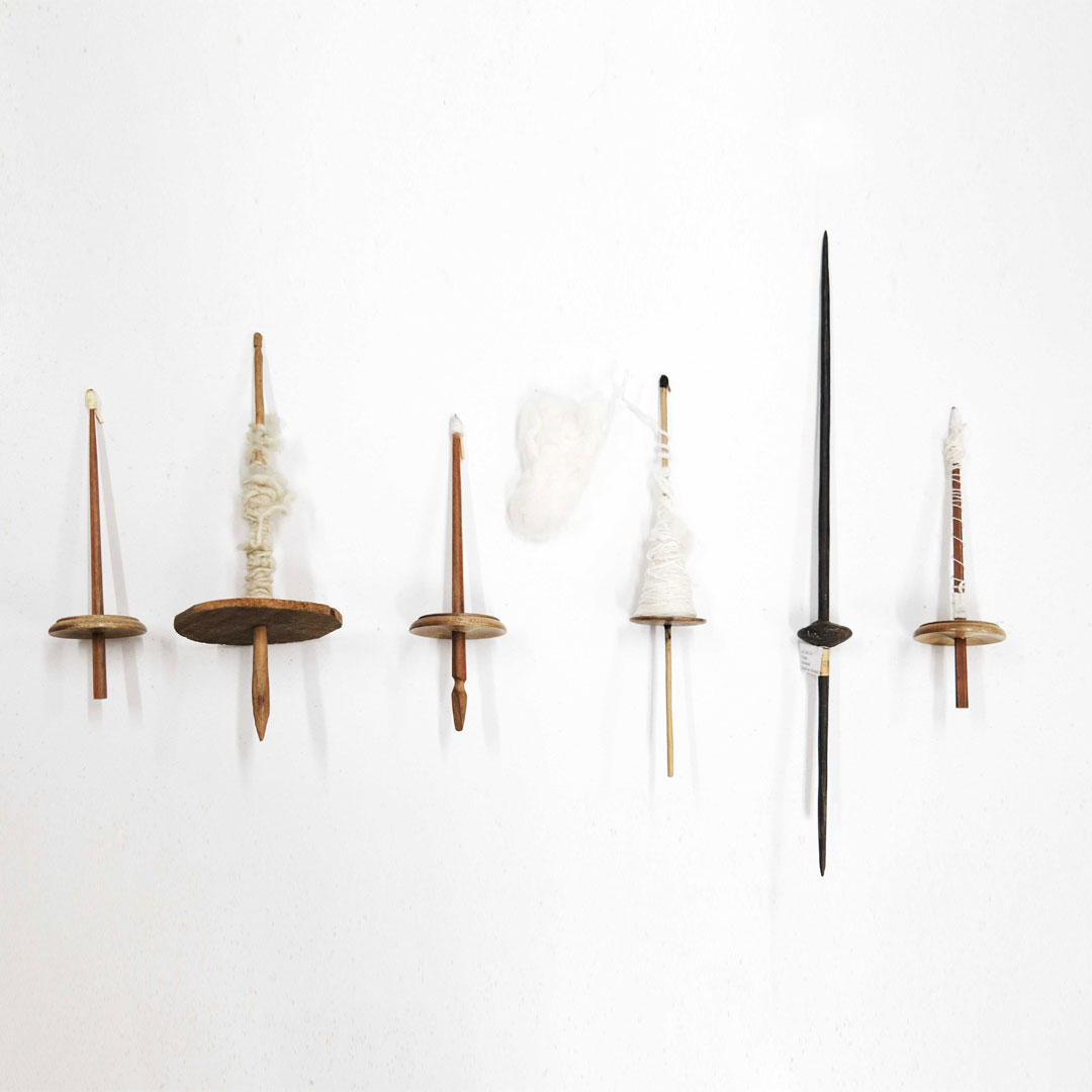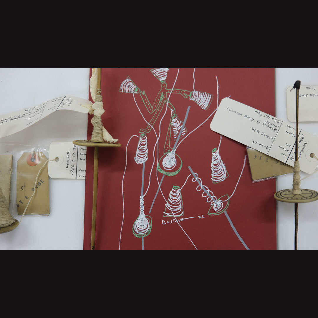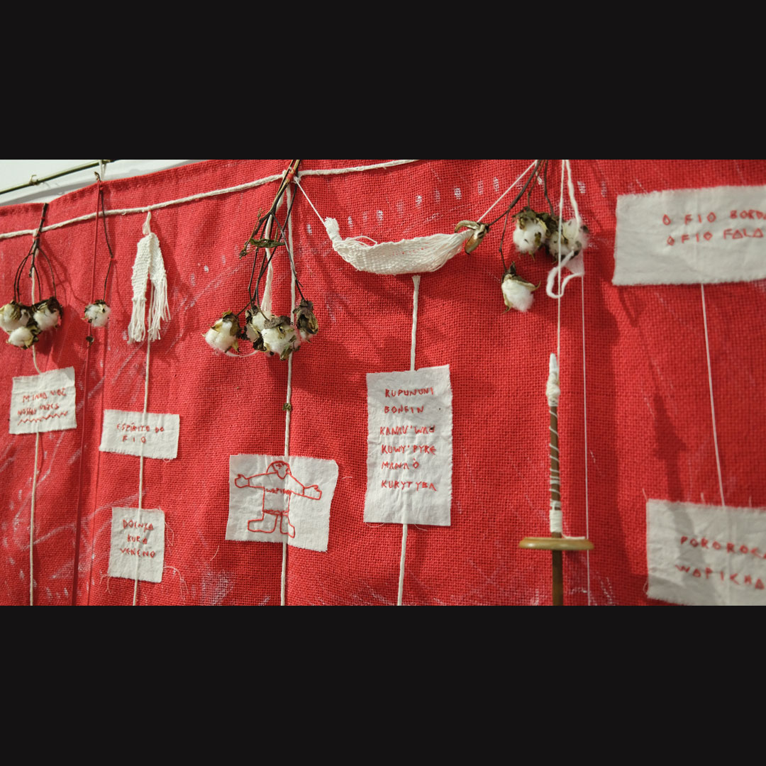 Gustavo Caboco encontros di-fusos, 2022 instalação vídeo performance, desenhos, fios de algodão Wapichana, bordados, fotografias, marcador sobre algodão cru, fio de algodão bordado sobre brim, tinta acrílica sobre algodão, máquina de costura, caroço de tucumã Coleção do artista Foto: Acervo do artista/ Divulgação