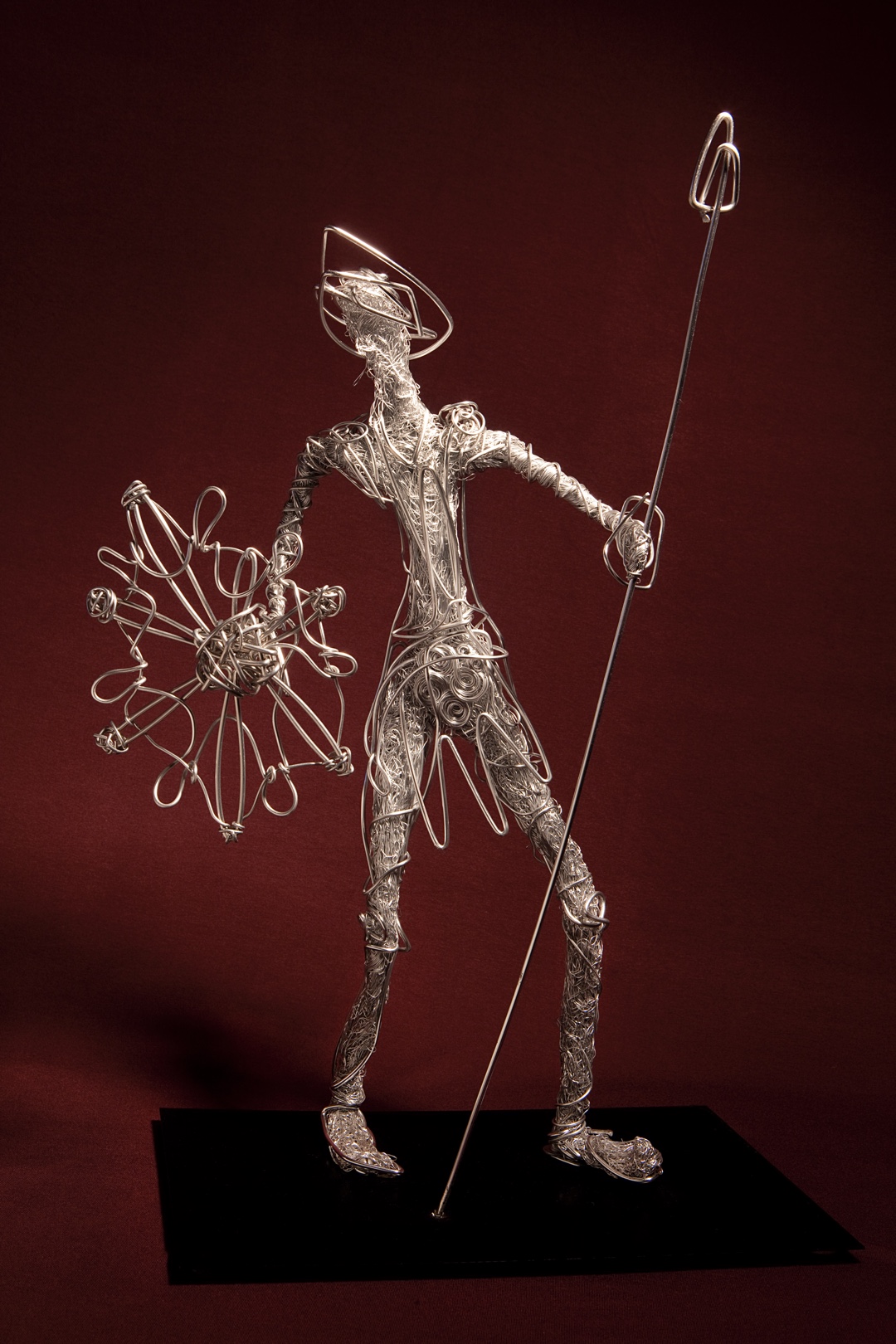 Escultura modelada em fios de alumínio prateado, de aproximadamente 40 cm de altura, que está presa a uma base quadrada preta de mármore. A obra representa um homem alto e magro que usa uma espécie de chapéu e roupa antiga, semelhante a um saiote. Sua indumentária é construída através de um fio mais espesso do que seu corpo. Na mão esquerda o homem segura uma lança que está apoiada no chão e que ultrapassa a altura de sua cabeça. Sua mão direita segura um escudo, também feito de um fio de alumínio mais espesso, que possui um formato arredondado e dez pontas não uniformes. Comentário do artista D. Quixote é um personagem que eu fiz no cinema e então eu resolvi tentar fazê-lo como escultura. Acabei que fiz esse e depois fiz mais outros, em outras escalas. É um personagem que eu gosto muito, de Miguel de Cervantes, e que eu tive a felicidade de interpretá-lo a minha maneira no cinema.