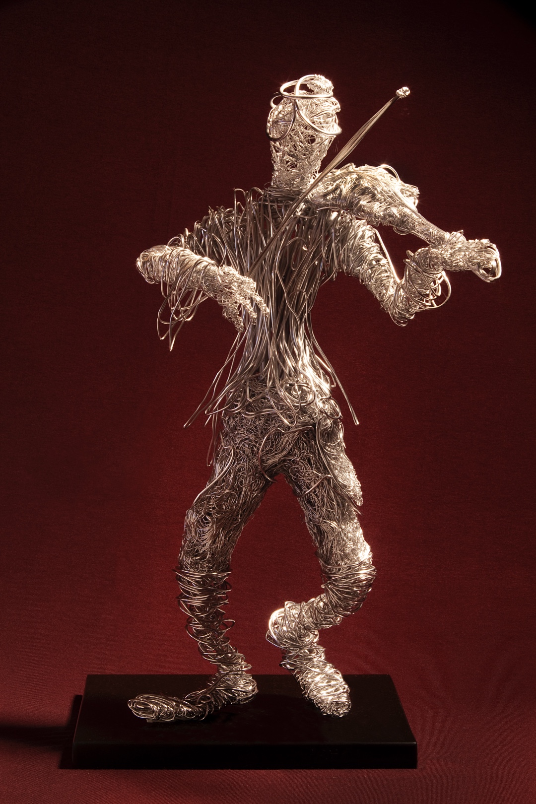 A escultura, com aproximadamente 40 centímetros, sobre base de granito preto, feita com fios de alumínio em diferentes tons de prateado e retorcidos, representa um homem tocando violino. Sua cabeça, sem detalhes na face, está ligeiramente inclinada para a direita. Seus braços e o violino são feitos de um fio claro e fino e o cabelo com um fio mais espesso que dá algumas voltas em torno da cabeça. No tronco do homem, os fios todos na vertical formam uma camisa, de tom um pouco mais escuro. Na mão direita, ele segura o arco do violino, apoiado no dedão e no indicador. Na mão esquerda, segura o braço do instrumento, que está apoiado também no seu ombro esquerdo. As coxas do homem são formadas por fio de alumínio bem fino, que se enrola até chegar aos joelhos, onde os fios ficam mais espessos e se enrolam chegando aos pés. O personagem está com os joelhos flexionados e o pé direito inteiro no chão. Do pé esquerdo somente a ponta toca a base. Comentário do artista Essa escultura é inspirada em personagens da música e do teatro e influenciada pelos musicais que eu já fiz, especialmente pela figura do Violinista no Telhado. É uma das esculturas que redescobri o uso do material, quando eu transformei o arame em uma massa para modelar. A obra é uma homenagem à música que me acompanha em cena e na vida, e faz parte das tramas do universo teatral pelo qual eu transito até hoje.