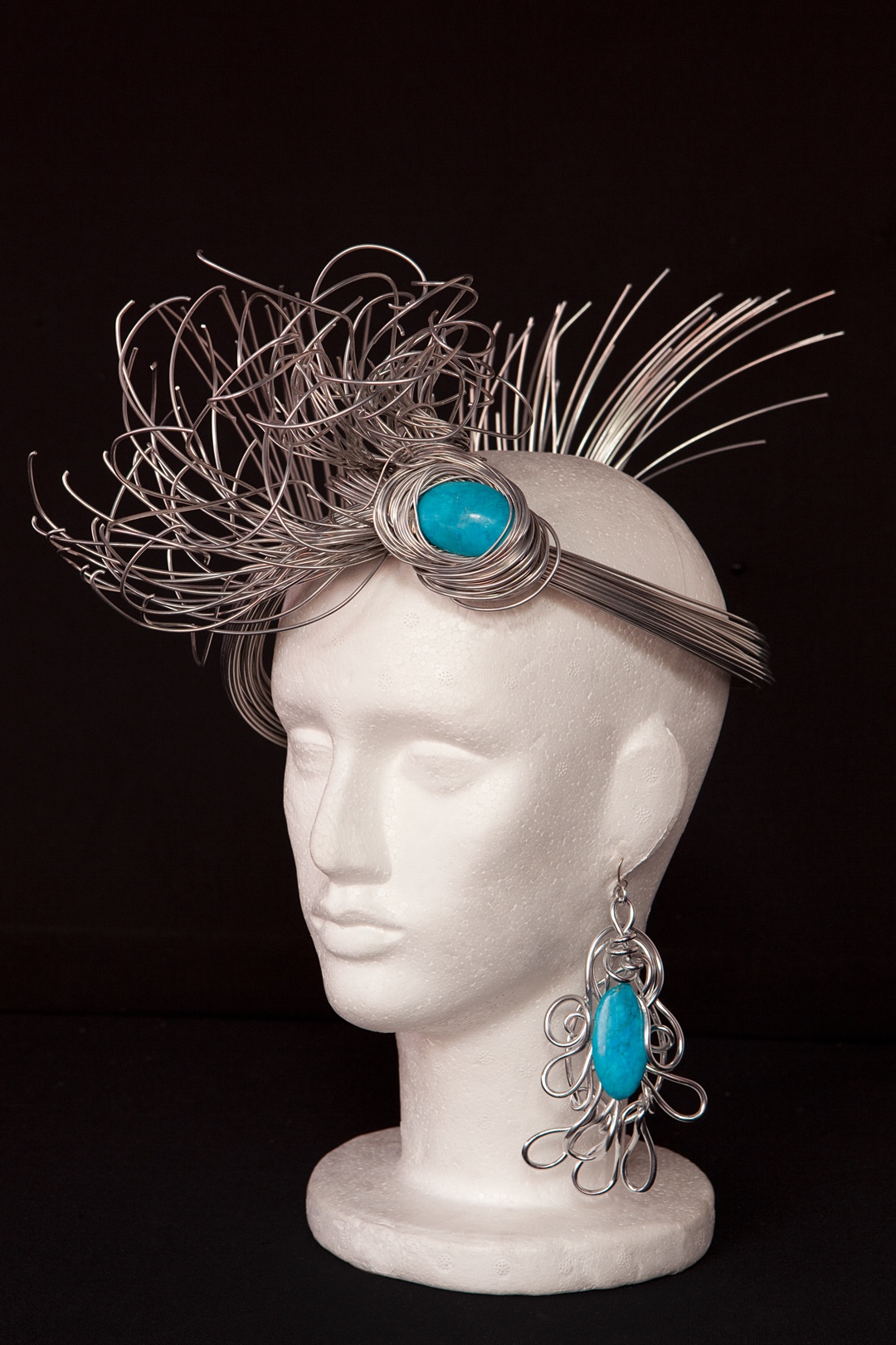 Uma cabeça de manequim veste duas joias. A primeira é na cabeça, como se fosse uma espécie de coroa. Ela é de fio de alumínio prateado e veste a cabeça do manequim de maneira arredondada, circulando a cabeça. Na testa há um nó do emaranhado de fios que, no centro, possui uma pedra azul turquesa. Do lado esquerdo da pedra, diversos arames fazendo curvas se entrelaçam apontando para cima. Na parte de trás da coroa outros fios apontam para cima. Na orelha direita o manequim possui um grande brinco pendurado. Esse brinco percorre toda a extensão do pescoço. No centro, uma grande pedra azul turquesa em formato ovalado é cercada por formas arredondadas de um fio de alumínio prateado espesso. Comentário do artista Eu fiz muitas dessas peças, dessa exposição, dentro de camarim de teatro e também inspirado por isso. Então ela tem essa coisa vistosa, grandiosa, do adereço teatral. Essa é uma cabeça com um brinco que poderia muito bem estar no palco.