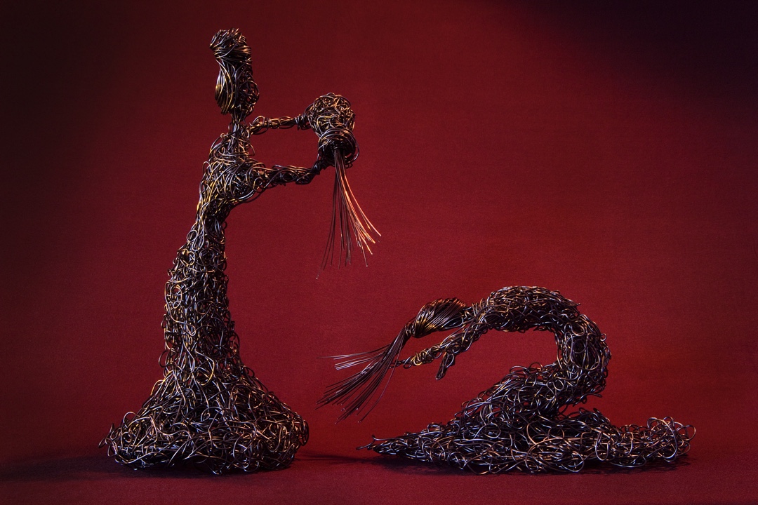 Escultura da figura de uma mulher, criada com fios de alumínio prateado, fino e retorcido, com aproximadamente 40 centímetros, sobre base de granito preto. A mulher usa um vestido longo, de saia comprida e esvoaçante. Na cintura, o fio de alumínio enrolado no sentido horizontal dá a ideia de uma faixa, que marca a forma do corpo. Mais acima, estruturas finas e tortuosas saem do tronco da mulher, algumas no sentido vertical, outras horizontalmente. Sobre a cabeça da mulher, o fio toma um formato cilíndrico que fica mais espesso e depois mais fino, com uma pequena espiral na ponta. Comentário do artista Morgana é uma obra que representa muitas figuras femininas que eu já fiz. Entre todas elas, essa foi a que se sobressaiu, saltou frente aos meus olhos, trazendo a força feminina arquetípica, guerreira e poderosa. Ao mesmo tempo, ela é fada, ela é bruxa. A escultura foi batizada de Morgana após ter se apresentado para mim através de um processo intuitivo, surgido das tramas e modelagens do material que trabalho, o arame.
