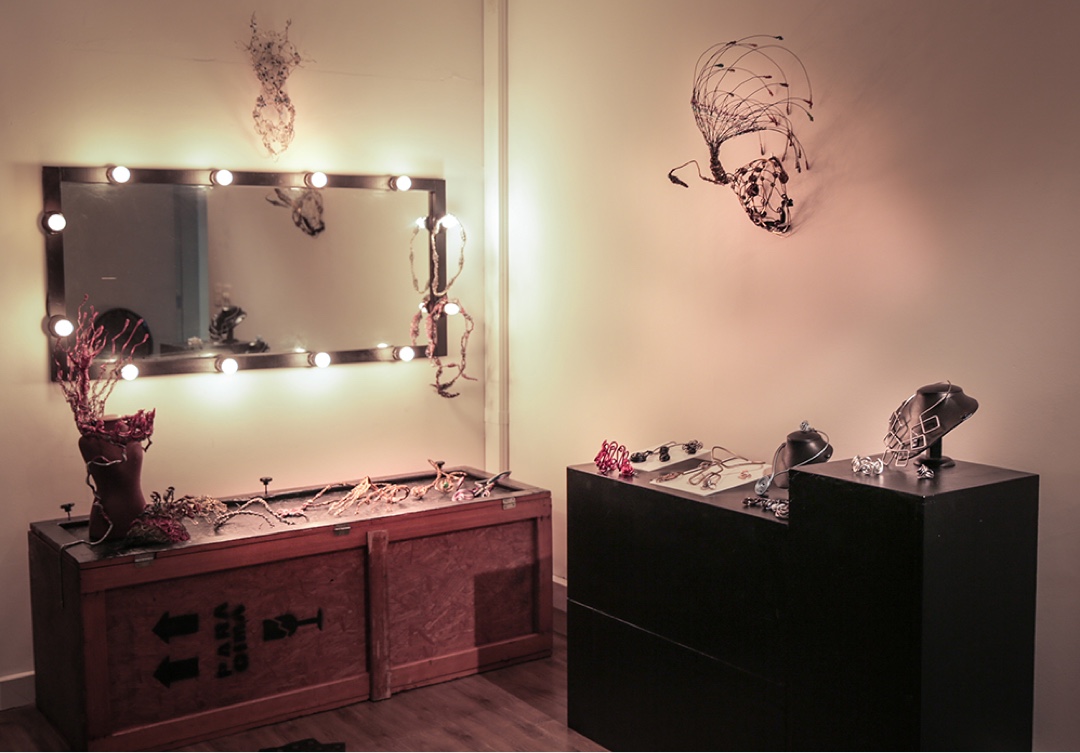 Instalação composta por um case de escultura retangular disposto horizontalmente que, como uma penteadeira, apoia objetos, acessórios e joias produzidas pelo artista para serem usadas em espetáculos e no cotidiano. Sobre a penteadeira, um espelho retangular horizontal com luzes em sua borda remete ao ambiente dos camarins. Ao lado, outro suporte expõe mais joias e acessórios, que estão disponíveis para serem adquiridos. As peças do camarim são cabeças, colares, brincos, pulseiras e anéis, e podem ser tocadas e experimentadas pelo visitante. Divirta-se tirando fotos e, ao publicar, use a #acessibilidade cultural. Comentário do artista Camarim é um lugar mágico pro artista. É o lugar onde o artista se sente acolhido. Quando você está num camarim, você está feliz. Por que você está em processo de criação, você está trabalhando, e nem sempre isso é uma constante na vida do ator. Então o camarim é lugar onde você se reúne com a família, que é o elenco. É onde você está em ebulição no processo de criação. E foi nessa onda da “vibe” da criação do personagem que eu introduzi a escultura, essa coisa com a mão, de fazer acessórios, enfim. É um lugar onde quando eu não estava maquiando ou estudando, eu ficava desenhando. Quando eu passei a usar essa material no camarim, as coisas começaram a tomar uma forma tridimensional. Mas é isso. O camarim antes de tudo é um lugar lúdico, onde você vive outros personagens, outra pessoa. Você é completamente livre para brincar. Então é um lugar muito lúdico. E aí eu achei bem plausível colocar também na exposição que chama Entreato, colocar esse camarim para que as pessoas também possam experienciar alguma coisa, essas peças, essas cabeças, que é tudo pra usar mesmo. Divirtam-se!