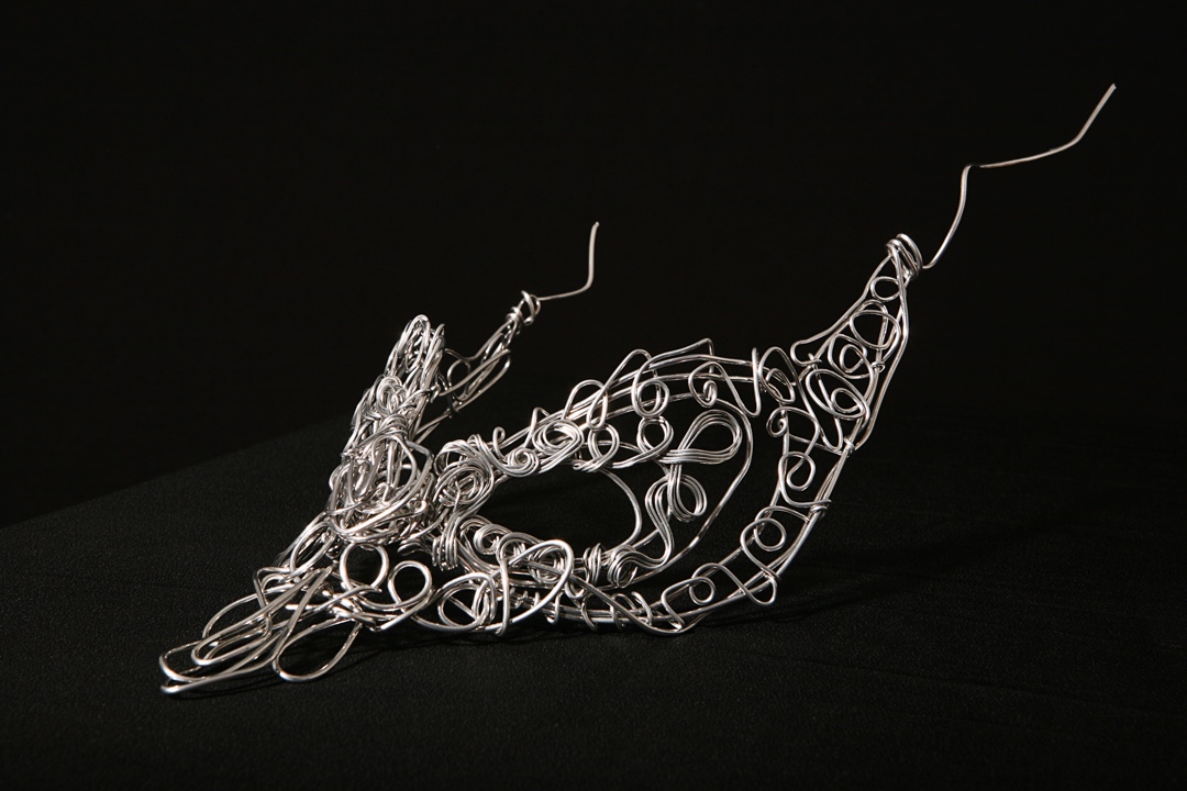Uma escultura de fios de alumínio entrelaçados, em tom prata e com diferentes espessuras, representa uma máscara. Ao longo de sua forma, diferentes círculos e tramas arredondadas se intercalam. Essa máscara é pontiaguda na extensão de onde estaria o nariz e tem grandes aberturas para os olhos. No centro, entre os olhos, ela se divide em duas partes que apontam para o topo da cabeça no formato de um terço de lua e nas pontas há apenas um fio que se direciona para cima, provavelmente extrapolando a extensão da cabeça. Comentário do artista A máscara é inspirada em Veneza, inspirada também nas máscaras do teatro. Eu acabei fazendo várias máscaras e coloquei essa nessa mostra para representar essa fase.