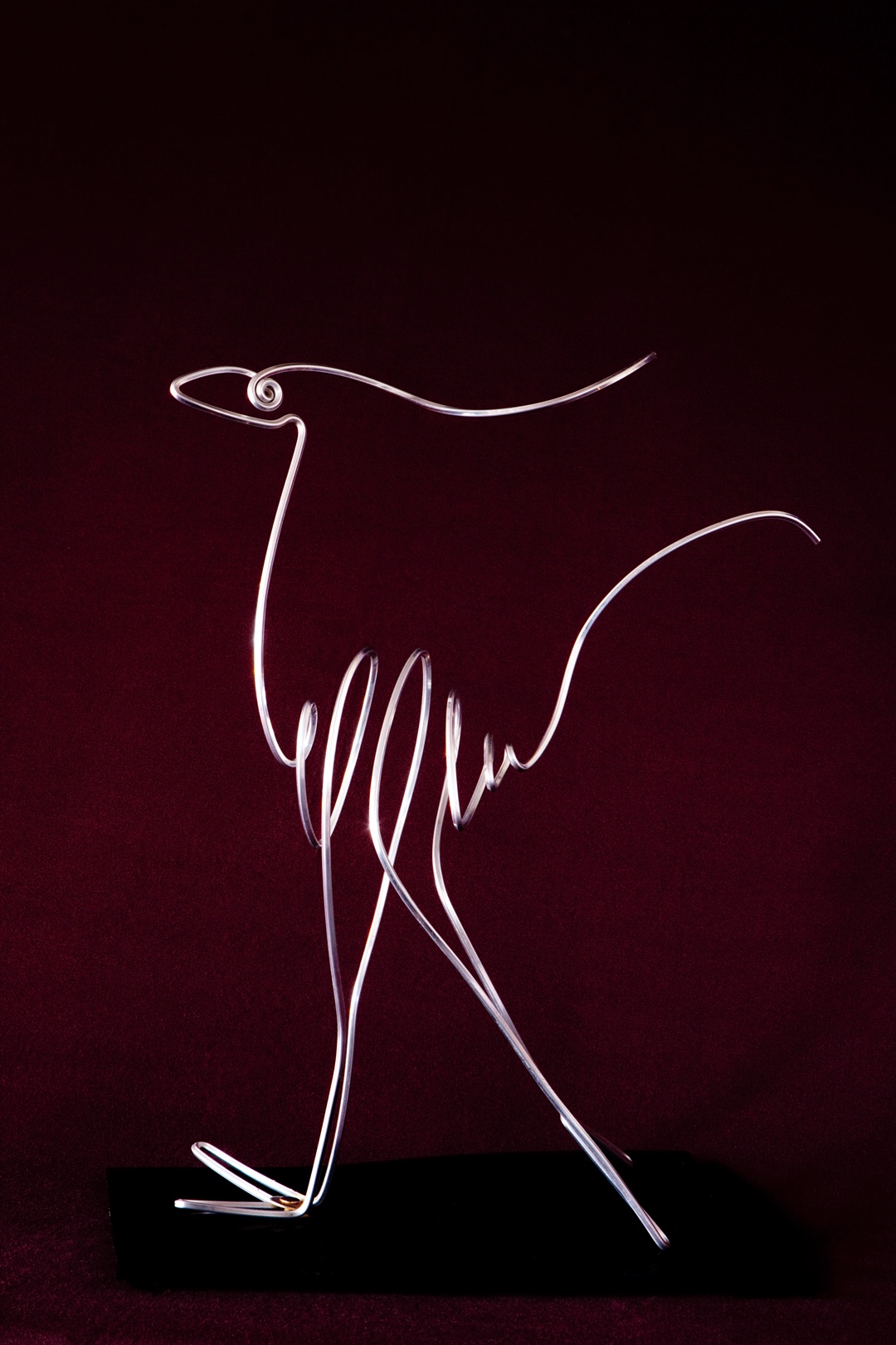 Um único fio de arame bem espesso e manipulado em diferentes direções forma, com traços bem simples, a imagem de uma ave do tipo galináceo. A escultura tem aproximadamente 35 centímetros de altura e está sobre uma base de granito preto. Uma das extremidades do fio faz o desenho da cauda do animal, ligando-se diretamente ao corpo, formado por uma espiral horizontal. Da espiral, saem os dois pés, que tocam o chão. Do outro lado da espiral sai o pescoço alongado e fino, na direção vertical. A cabeça ligada ao pescoço tem um bico, os olhos e, por fim, uma crista. Ao lado há outra escultura semelhante, posicionada de forma diferente. Comentário do artista Uma figura muito importante. O galináceo foi criado por mim como símbolo da OSCIP Mais Diferenças. Apesar de eu ter feito mais de cem peças, os galináceos são todos diferentes entre si, mesmo sendo muito parecidos. O universal e o singular. Um desenho tridimensional com um só fio de arame representa a síntese que cheguei após um longo tempo de trabalho com arame. Manipulando o mesmo material sempre surgirão inúmeras possibilidades de uso e de criação. Eu sinto que muita coisa ainda está por vir.