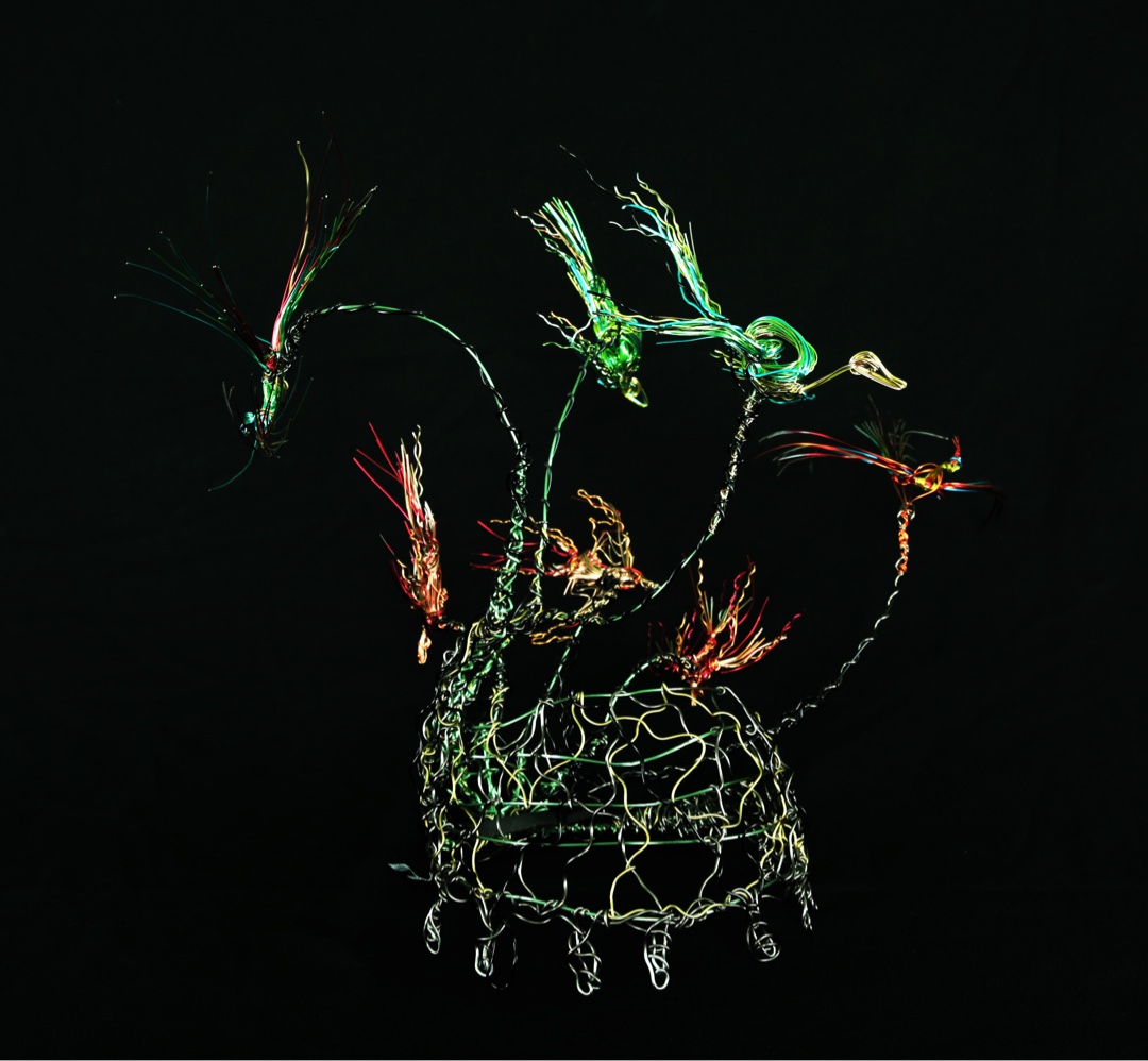 Uma cabeça de manequim veste um acessório tramado em fios de alumínio nas cores preto, verde e bronze. Como uma faixa, a trama envolve a cabeça na altura da testa, chegando às sobrancelhas e formando pequenas pontas arredondadas, como gotas, na parte inferior. Na lateral direita, essa faixa se torna maior e se direciona para o alto, de onde saem saem sete hastes de alumínio cuidadosamente entrelaçadas, que vão afinando nas pontas. Em cada uma das pontas, há uma ave, sendo que três delas, que saem de hastes mais curtas e ficam na parte de trás da cabeça, tem tons de vermelho e dourado. A quarta ave está apoiada na ponta de uma haste mais alta e fina, que também sai da parte de trás da cabeça, e tem tons de vermelho, amarelo, azul e cobre. Nas outras três hastes que partem da lateral direita e são mais altas, uma ave é moldada em fios azuis, verdes e vermelhos e as outras duas em fios verdes, azuis, amarelos e cobres. As sete aves estão de asas abertas e têm caudas alongadas e, por serem esculpidas com muitos fios finos, trazem um aspecto de leveza e movimento. Comentário do artista Revoada surgiu dos pássaros mesmo. Eu criei um pássaro, depois outro pássaro, e quis colocá-los voando. Eles me trazem a ideia de abstração, contemplação e, consequentemente, inspiração para criar alguma coisa. De repente surgiu a ideia de colocá-los todos juntos e em uma cabeça, o que é significativo porque pássaros sobre a cabeça trazem novas ideias.
