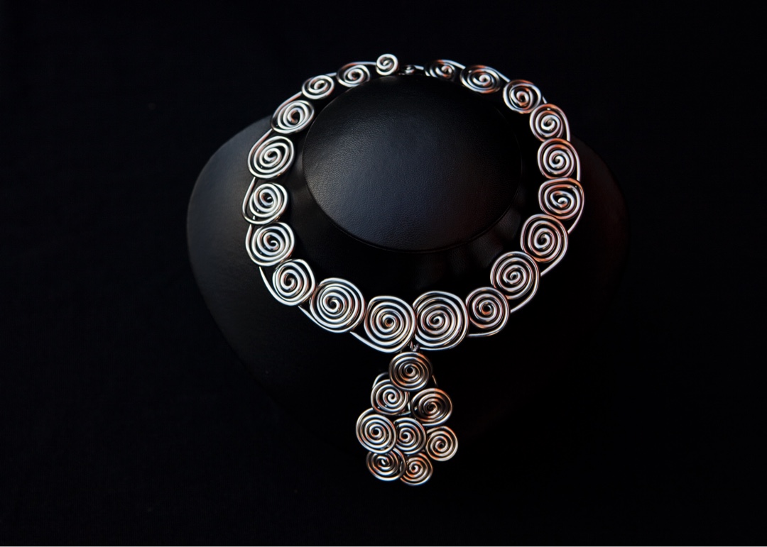 Um colar prateado, apoiado em um dorso preto de manequim, possui uma forma arredondada. Tramado em fio espesso, o colar percorre o pescoço do manequim até a nuca, sendo constituído por cerca 20 círculos em forma de caracóis que, à medida que se acercam da nuca, vão diminuindo em tamanho. Na parte da frente, no centro do colar, pendurado como se fosse um pingente, oito círculos também encaracolados constituem uma forma que se parece a uma pera. Comentário do artista O Colar Triskleniano é inspirado em símbolos celtas. São várias espirais que vão se repetindo e são eternos ciclos que se repetem e eu tentei colocar em uma peça de uso cotidiano.