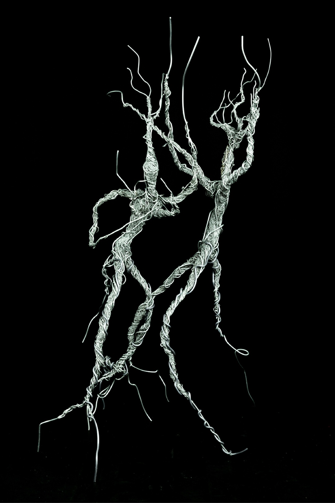 Obra composta por duas esculturas de fios de alumínio em tons de grafite e prateado, posicionadas no chão. Seres com um aspecto humano e longilíneo, as esculturas parecem lançar seus tentáculos em várias direções. A primeira delas tem, onde seria o pé esquerdo, três fios espessos, criando uma forma semelhante a uma raiz, e onde seria o pé direito, dois fios também espessos, quase como se fossem galhos. As pernas são longas e esguias, tramadas em arame muito fino, de maneira a não serem ultrapassadas pela luz. O corpo também é esbelto, de onde sai um tentáculo na parte de trás do quadril, dois na altura dos braços, formando esses membros, e mais dois na altura dos ombros, como se esse ser estivesse criando asas. Acima dos ombros, a cabeça, que do topo vai se alongando e afinando até terminar em várias antenas para cima. Em toda a escultura há fios mais espessos sobrepostos aos fios finos. Todo este primeiro ser está inclinado para a esquerda. A segunda Mandrágora se apoia em longos e espessos fios no lugar de pés e suas pernas são finas e longilíneas. Seu tronco inclina-se ligeiramente para frente e suporta vários tentáculos: um atrás, no quadril, que chega a tocar no chão; dois na altura dos braços e que se erguem para o alto e um no centro, na altura do coração, saindo para frente e subindo. A cabeça carrega no topo um conjunto de hastes, como antenas que buscam o alto em várias direções. Comentário do artista Mandrágora já soa muito bem, não é? E a imagem da mandrágora também é muito bonita. Mandrágora é uma planta cuja raiz lembra uma forma humana e já tem um texto de teatro que chama Mandrágora, do Maquiavel, e Shakespeare a cita como uma substância que a Julieta teria usado naquela poção mágica que a levou a aquele sono profundo. Ela também foi utilizada na idade média em rituais de magia negra. Tem uma história bem esquisita, também, que a semente da mandrágora teria sido o sêmen de um cara que morreu enforcado. Enfim, tem muitas lendas em cima da mandrágora. Mas a imagem dela é a mais bacana mesmo.