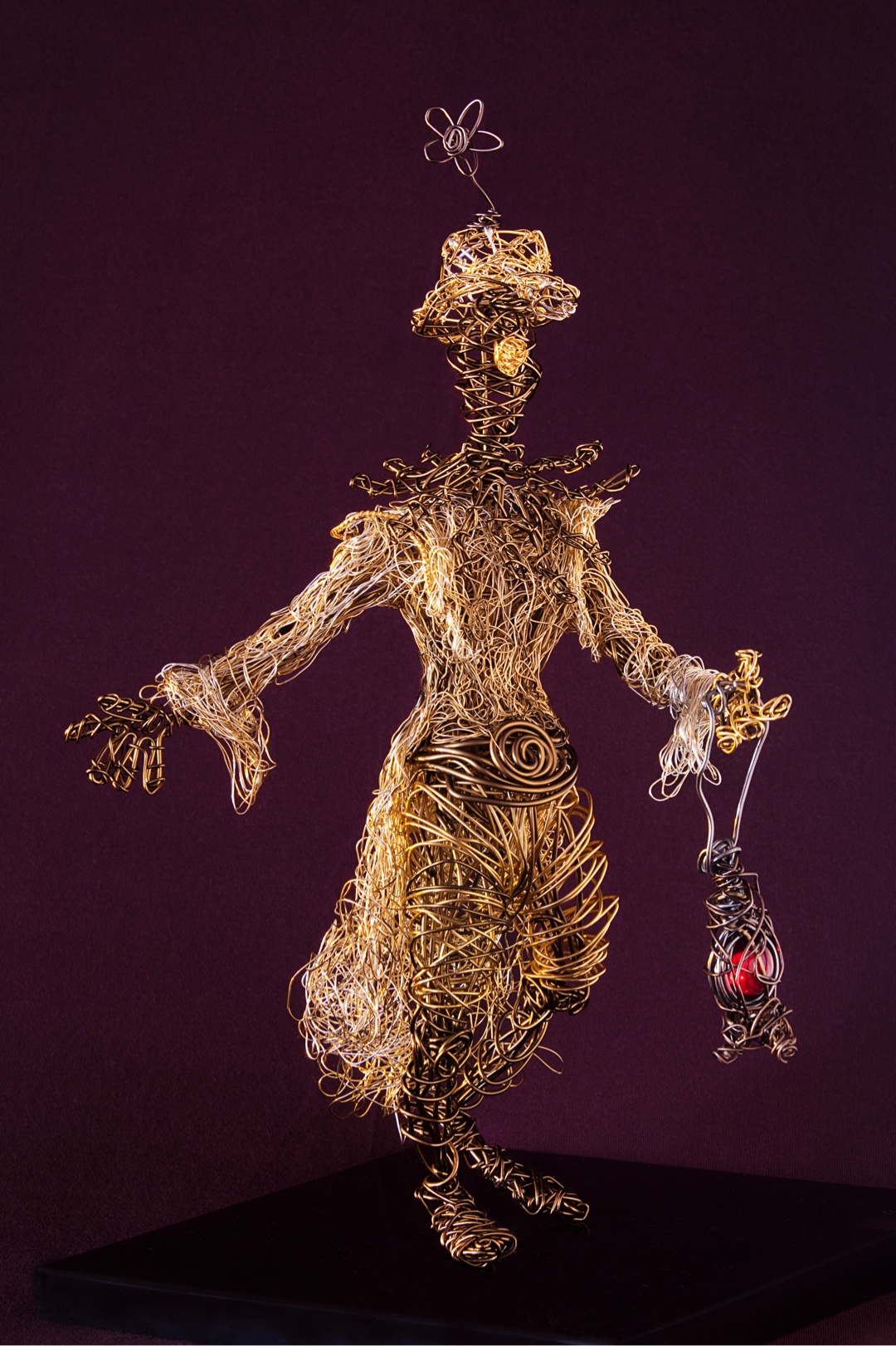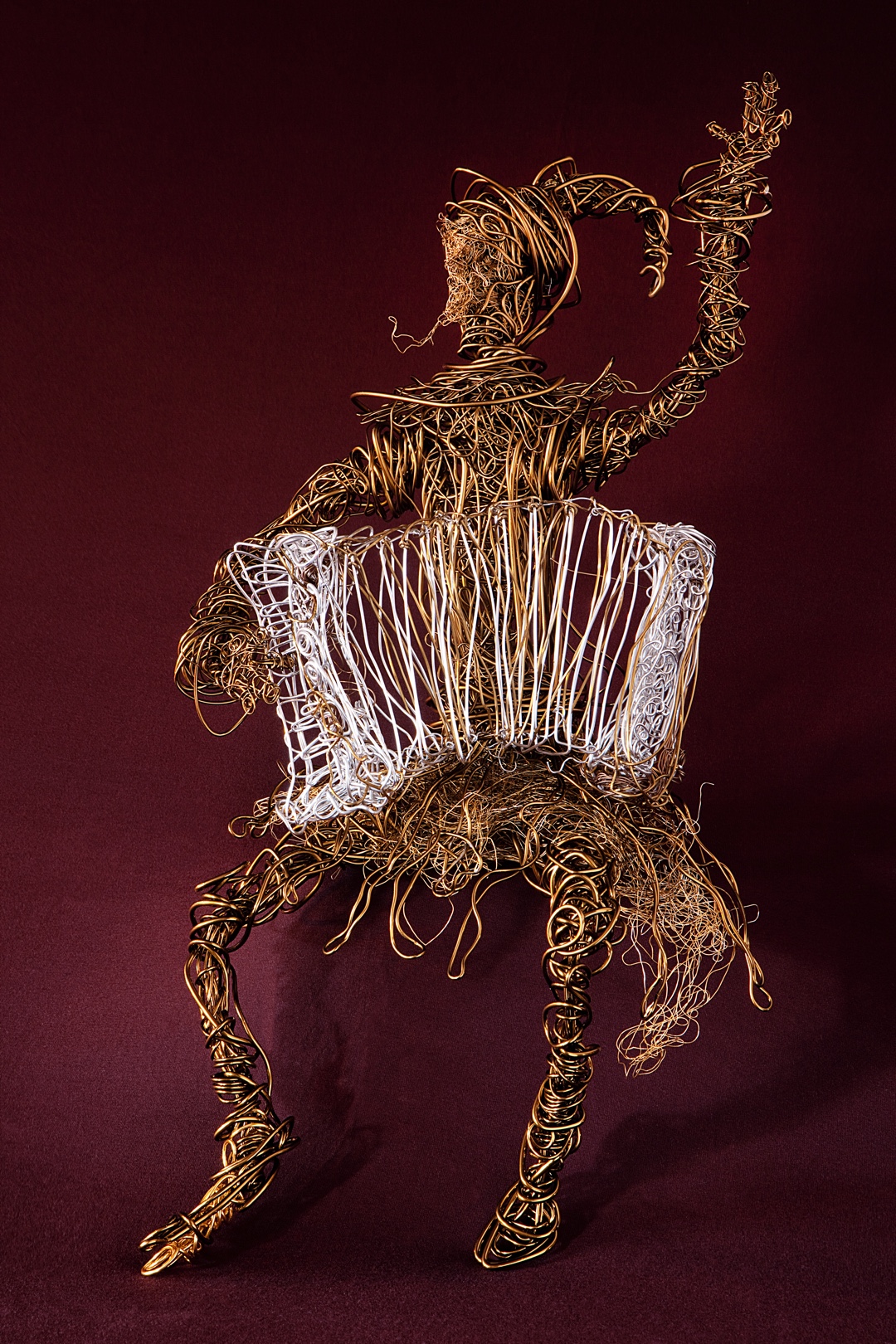Escultura de 30 centímetros em fios de alumínio, de nome Shakespearito, tramada em tons de prata, ouro e bronze, que se mesclam em toda a obra. Sobre uma base preta e quadrada está uma figura apoiada nas pontas dos pés, que foram tramados em fios de espessura média. O personagem tem o corpo todo entrelaçado por fios de alumínio muito finos, que, em suas inúmeras voltas, dá forma à roupa. A calça é bufante, tem volume na altura das coxas e vai se fechando nas canelas. Na parte da frente, logo abaixo da cintura, uma trama maior que forma um círculo no centro e desce em um quase zigue-zague até os joelhos. A parte superior do tronco revela uma blusa com mangas que se alargam, formando um babado fluido nos punhos. O rosto de Shakespearito é tramado em fio de espessura média que vai descendo circularmente até a altura do pescoço, terminando em um babado, semelhante à gola de um palhaço. No nariz, há um círculo em trama fechada, de fio fino e em tom de dourado. Sobre a cabeça há um chapéu coco com uma flor espetada para cima. O braço direito do personagem está aberto e tem a mão espalmada para frente e para cima. O braço esquerdo está voltado para frente e da mão pende uma lanterna que tem no centro uma pedra vermelha. Comentário do artista Esse foi um prêmio. Um personagem que eu ganhei para fazer o espetáculo “Acordes Celestinos”. O Shakespearito é um palhaço de circo mambembe, um palhaço que escreve a própria história narrada no espetáculo e que tem a oportunidade única de reencarnar como um cantor de tango nesse espetáculo. Para mim ele representa a oportunidade de rever o momento vivido, reinventando a própria história.