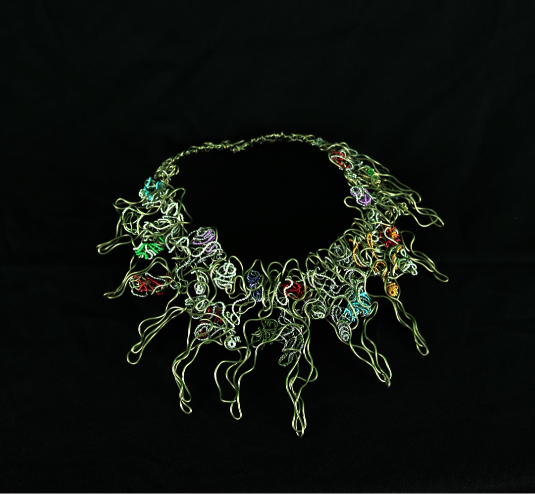 Tramado em fios de alumínio, o colar envolve um dorso feminino de manequim. O fio, que dá base e forma ao colar, tem espessura média e tom acinzentado. Com inúmeras curvas, o fio vai produzindo formas sinuosas, menores atrás e maiores na frente. As curvas se avolumam e preenchem o colo, terminando em pontas, também crescentes de trás para frente. Entremeados aos fios de tom cinza, outros fios retorcidos, formam alegres pontos de cor prata, azul, amarelo, vermelho, verde e roxo. Comentário do artista Esse Colar Ninfa é muito teatral e, na verdade, a característica dele é que é versátil. Ele tanto pode vir ao pescoço e, se você invertê-lo você coloca na cabeça, e ele pode te levar a alguma coisa de fadas, que o que dá nome a ele. Eu me inspirei um pouco em “Sonhos de uma noite de verão”, nas próprias ninfas. Ele pode funcionar como máscara se você colocá-lo em frente aos olhos, já experimentei também e funciona assim.
