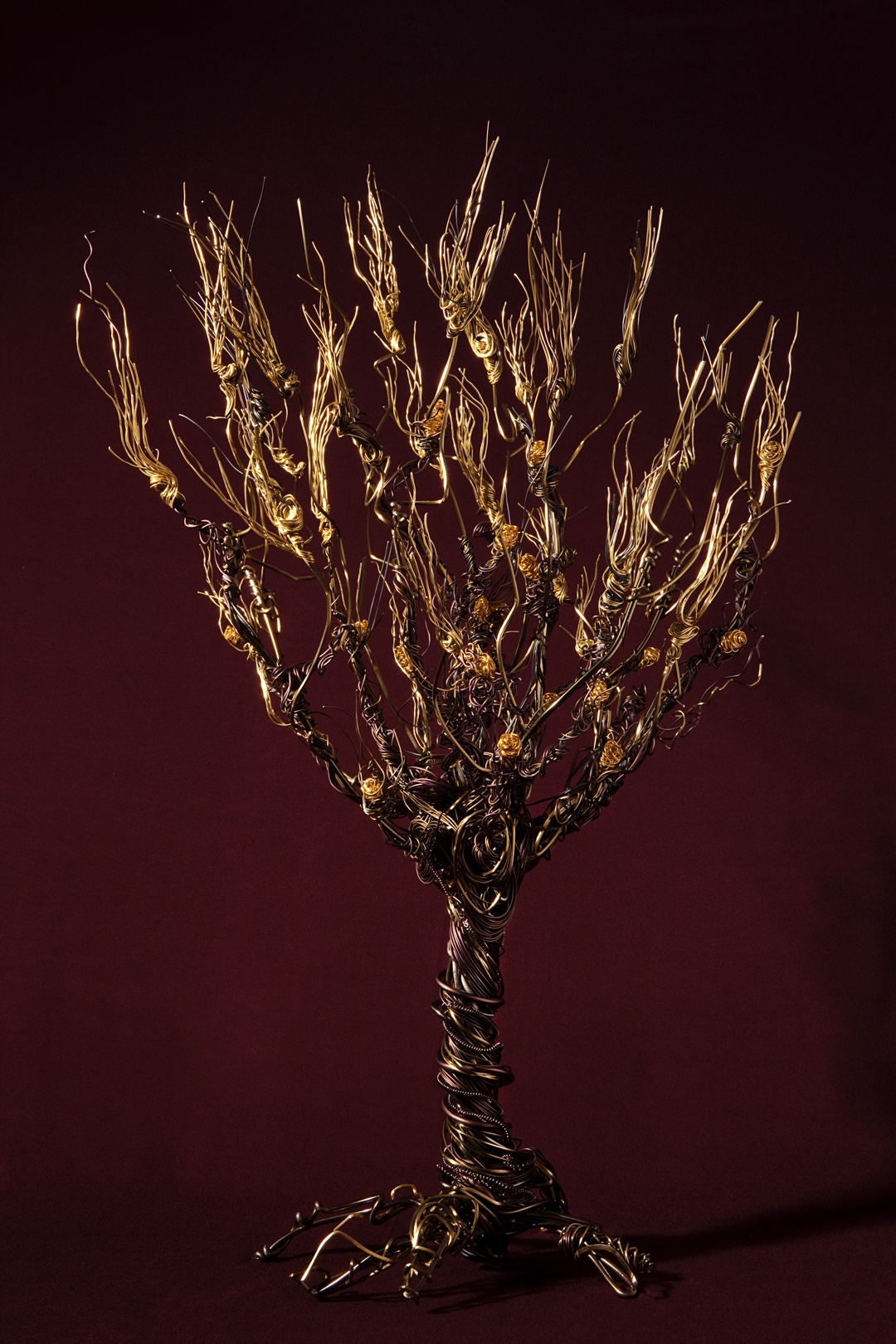 Escultura de uma árvore, de aproximadamente 50 centímetros, sobre base de granito preto. A obra foi feita com fios de alumínio de diferentes espessuras em tons de dourado, cobre e bronze. Em um fio bem espesso cor de bronze, as raízes da árvore se unem e formam o tronco com movimentos circulares. Da parte inferior da copa da árvore nascem vários galhos, formados por fios de cor cobre e voltados para cima. Há também, em cada galho, pequenas esferas de fio acobreado. Mais acima, a ponta dos galhos é dourada, feita com fios mais finos entrelaçados. Comentário do artista Árvore para mim é símbolo de vida e de sobrevida. É uma resistência ao tempo, um renascimento.