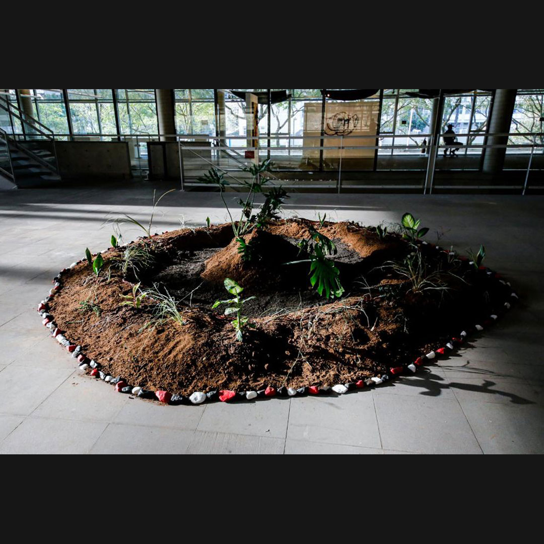 Agrippina R. Manhattan é artista e pesquisadora. Nasceu e cresceu em São Gonçalo. Seu trabalho é parte de uma profunda preocupação sobre tudo o que restringe a liberdade: a palavra, a norma, a hierarquia, o pensamento. Escolheu seu nome e inventou a si mesma, assim como escolhe um título para um trabalho ou encontra a tradução do que sente em poesia. Pensa escultura como poesia, poesia como escultura e tudo como uma coisa só. A artista trabalha sempre buscando interpelar criticamente a história da arte brasileira, entendida como de exceção em relação à produção dos transgêneros, de mulheres, de indígenas, de negros e de outras minorias sociais. Na instalação intitulada Erva daninha, composta de terra, plantas, extensões elétricas e monitor em LED, a artista parte de uma investigação em que relaciona humanidade e natureza, assim como a simbologia da serpente que devora o próprio rabo. Isso tudo tendo como horizonte as comemorações acerca do modernismo brasileiro. Para Agrippina, o modernismo é um projeto que já se encontra em ruínas, uma vez que a sociedade vive uma eterna transmutação, e que, portanto, se auto-consome. E, assim sendo, o que nos resta são apenas fragmentos, desgastados e dilapidados, assolados pelas ervas daninhas que soterram os escombros da civilização. Para essa artista carioca, o mal está em toda parte, nas fímbrias do cotidiano, crescendo pouco a pouco, aos olhos de todo mundo e, se não for extirpado, cria raízes. Fotos: Karim Khan