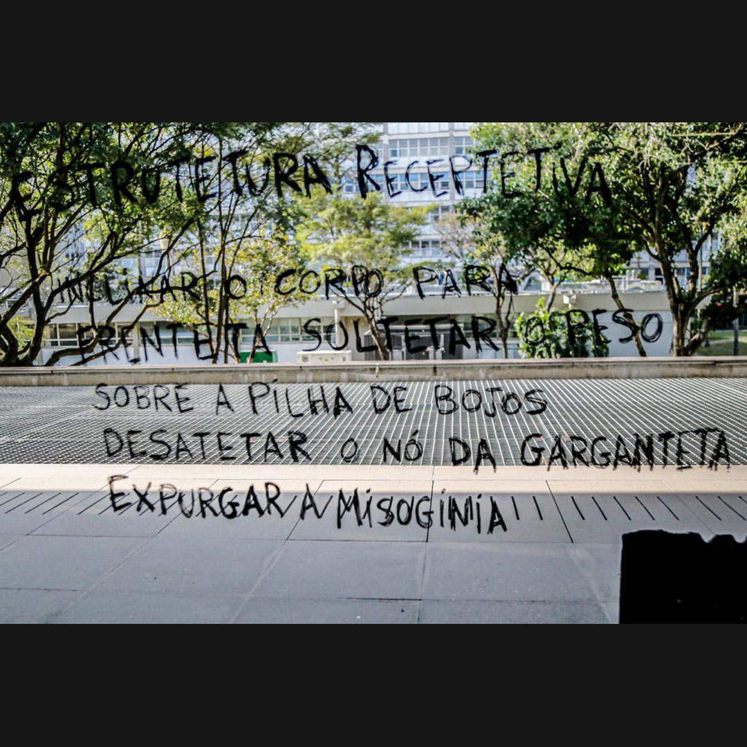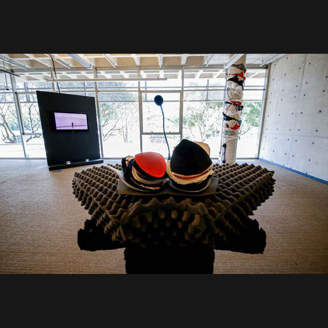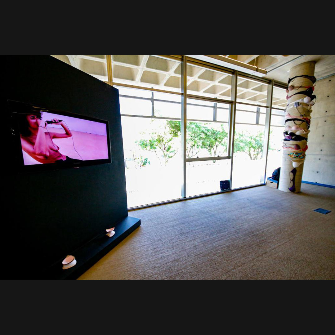 Tetta Marie Carangi é artista recifense que atua na criação de contextos e situações cujo foco no corpo feminizado vincula-se a uma narrativa estética e política autoreferentes. Usa técnicas transdisciplinares para articular demandas emancipatórias através de intervenção física direta. Suas performances desdobram-se em instalações de vídeo, arte sonora, fotografia e objeto. Em Instetâncias de Poder, Tetta articula estruturas que se relacionam entre si com o propósito de reivindicar espaços nos quais o corpo possa existir fora de categorizações preexistentes. Na videoperformance des-hino iNacional, voz e gesto esbarram, nem sempre harmonicamente, na arquitetura modernista de Brasília, gerando ecos e efeitos sonoros produzidos pela manipulação de microfones e apito de nariz. Ao inflar a matéria sonora e garantir sua propagação na arquitetura côncava e convexa da capital federal, Tetta busca irromper o espaço, remodelando a comunicação. Dessa especulação emergem novas proposições linguísticas, as quais escapam às normas gramaticais, ainda que criem ambiente propício para a realização de sujeitos apartados das estruturas normativas. Já para a escultura interativa Pulpiteto para Pronunciamentetas, a artista pondera sobre uma percepção sensitiva particularizada da própria voz, uma vez que repropõe a postura para um pronunciamento. No pulpiteto o peitoral é acolhido enquanto o diafragma é comprimido. Encerrando o arcabouço, o sutiã: peça íntima publicamente associada ao gênero feminino e cujo uso, segundo a artista, relaciona-se à autoestima, proteção, sensualidade, aprisionamento, armadilha e ‘desconforteto’. Para Tetta, Intetâncias de Poder é espaço para amplificação de debates sociais antirracistas, antimisoginia e antitransfobia. Essa obra reverbera, em espaço institucional, questões sobre a violência sofrida por mulheres, lésbicas, travestis, trans e dissidentes de gênero, principalmente nos espaços de poder. ficha tetecnica: câmera: Maria Eugênia Matricardi // performance, concepção, edição: Tetta Marie Carangi // mixagem de som 3d: bella // montagem técnica de som: Fusionáudio // produção: Lorenna Pipa // agradecimentetas: Mari Pini & doadoras de sutiãs Fotos: Karim Khan