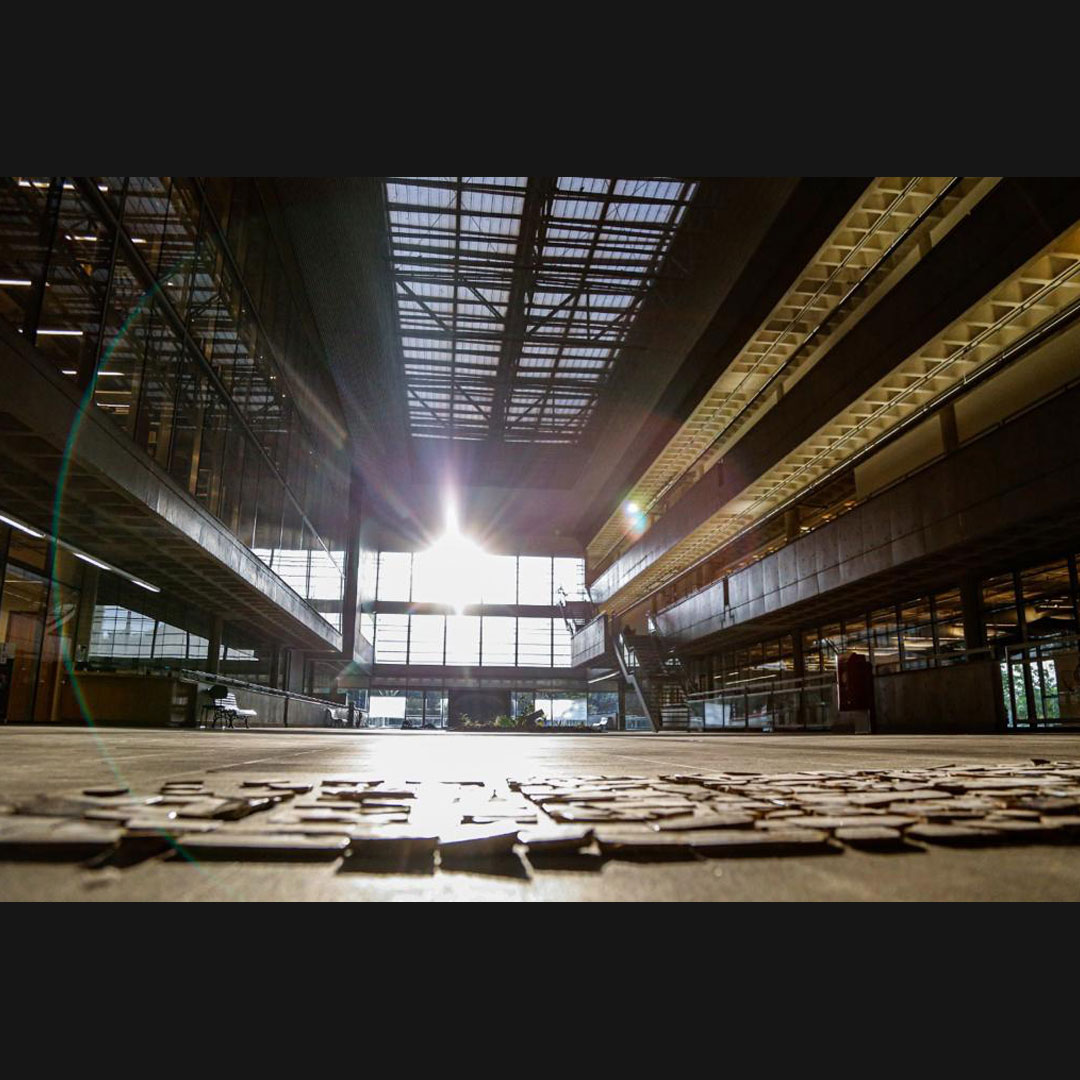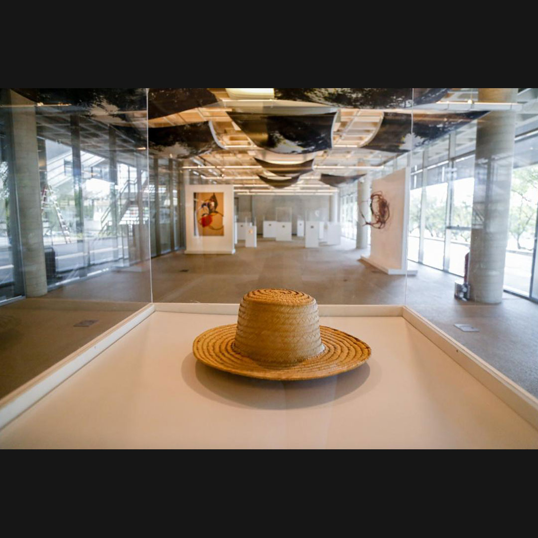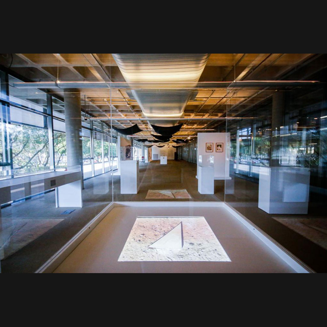 Cinthia Marcelle é artista visual nascida em Belo Horizonte. Desenvolve seu trabalho a partir de diversas mídias, utilizando-se de materiais, artefatos e procedimentos da vida cotidiana ou dos locais onde expõe, de maneira improvável. Essa sua investigação poética suscita possibilidades diversificadas de ordenamento das coisas, desorganizando-as. É dessa consciência que a artista repropõe “Verdade ou Desafio” para as salas do IEB/USP. Exposto pela primeira vez em março de 2018, no Modern Art Oxford, o vídeo, realizado por um software desenvolvido a pedido da artista, por Pedro Veneroso, a partir de uma fotografia de celular feita na África do Sul, apresenta um trígono sobre fundo de terra batida, que, em loop, gira em torno do próprio eixo em movimentos simétricos (em sentido horário e anti-horário, alternado por pequena pausa). Se o movimento do triângulo no filme lembra o da agulha de uma bússola ou do ponteiro de um relógio, ele também evoca o passatempo “verdade ou desafio”. Ao relacionar o vídeo às vitrines vazias do Instituto, em paralelo à figura de Mário de Andrade, representada por seu chapéu de palha, Cinthia rediscute o tema da memória cultural pautada pela construção da ideia de nação brasileira no singular. A incerteza, sobre esta pretensa idéia de nação que opera, contudo, em estado de crise permanente, facultada pela polissemia do trígono apontando para vitrines vazias, abre uma discussão ampla, pois enseja à impermaência e ao devir, uma vez que indicia, em perspectiva decolonial, que a preservação e a apresentação de acervos memoriais como os que pertencem ao IEB devem ser pensados de modo crítico e sempre à luz das necessidades atuais da nossa sociedade. Produção e montagem: Marcelo X // Assitente de montagem: Edison Silva // Marcenaria: Wanderley Wagner da Silva // Mapping: Ciça Lucchesi // Programação/Finalização vídeo: Pedro Veneroso // Desenho Sonoro vídeo: Pedro Durães Fotos: Karim Khan