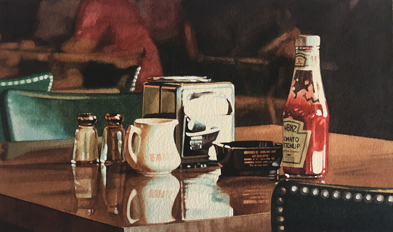 Ralph Goings Ele foi um dos artistas selecionados para definir o movimento fotorrealista na década de 1960 e início dos anos 70. Suas pinturas a óleo e aquarelas geralmente retratam precisamente instantâneos do estilo de vida americano da classe trabalhadora, que frequentemente incluíam lanchonetes americanas, caminhonetes e pinturas de natureza morta de condimentos e demais alimentos. O estereótipo do ""sonho americano"" era eternizado em sua obra. Nesta mostra apresentamos seis trabalhos de Ralph Goings das décadas de 70 e 80, mostrando uma clara evolução de sua produção artística, partindo do espaço externo, repleto de simbologias da sociedade americana, seguindo para a reprodução do espaço interno de um restaurante até focar em suas minúcias – detalhes dos objetos sobrepostos sobre a mesa. Nota-se que seu interesse evoluiu do macrocosmo para o microcosmo do cotidiano americano.